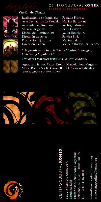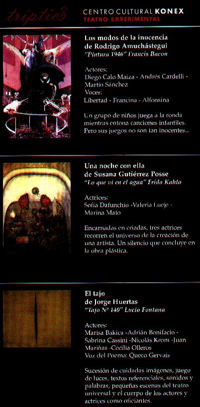 Una noche con ella Obra incluida en el espectáculo TRIPTICO.de Susana Gutiérrez Posse(Basado en la pintura “Lo que vi en el agua o lo que el agua me dio”.1938. De Frida Kahlo). Teatro Experimental TrípticoTres Obras Teatrales Inspiradas en Tres CuadrosUn Puente Entre la Plástica y el Teatro Dirección: Marcela Rodríguez Blanco